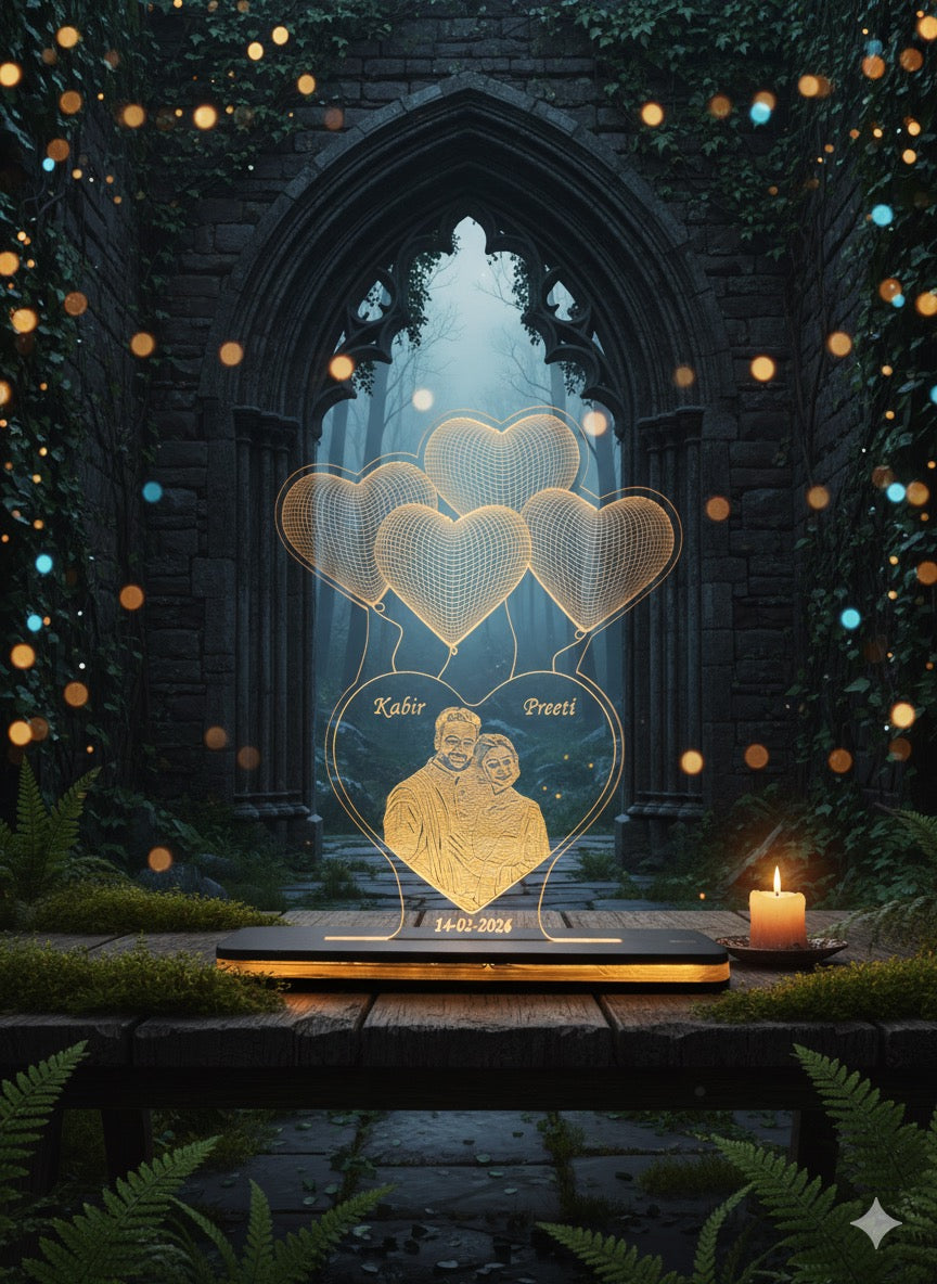 | Celebrate your love story with this exquisite Personalized Photo LED Lamp. Designed to capture your most cherished memories, this lamp features a beautiful array of heart balloons hovering above a central heart where your photo, names (like Kabir & Preeti), and a special date (14-03-2026) are expertly engraved. |
